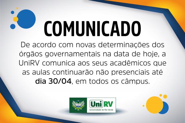 De acordo com novas determinações dos órgãos governamentais divulgadas nesta terça-feira, 31, a Universidade de Rio Verde - UniRV comunica aos seus acadêmicos que as aulas continuarão não presenciais até dia 30/04, em todos os câmpus.