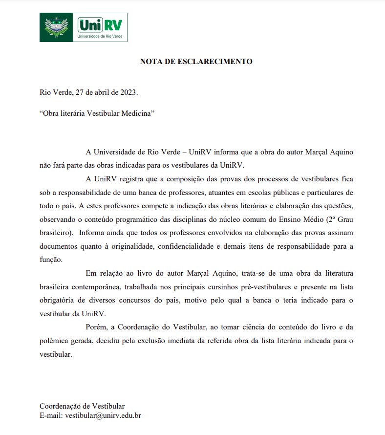 The University of Rio Verde – UniRV informs that the book by Marçal Aquino will not be a part of the recommendations for UniRV’s Admissions Exams.