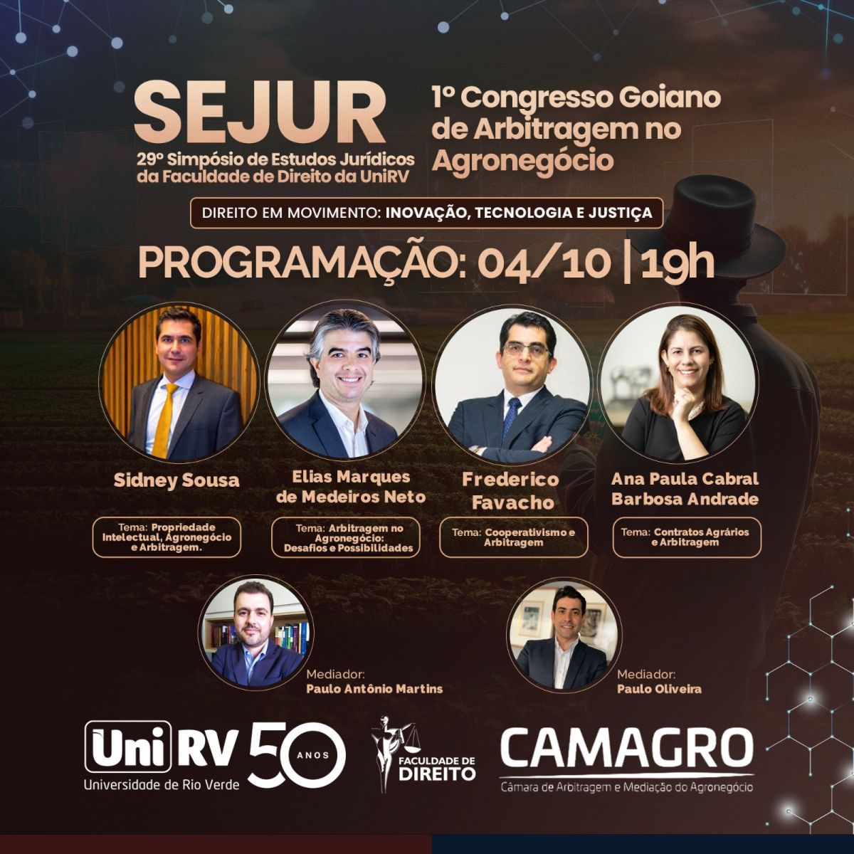 A Faculdade de Direito inicia nesta segunda-feira, dia 02 de outubro, o 29° Simpósio de Estudos Jurídicos. O evento ocorre presencialmente no Centro de Convenções da UniRV, daté o dia 05 de outubro, a partir das 19h.
