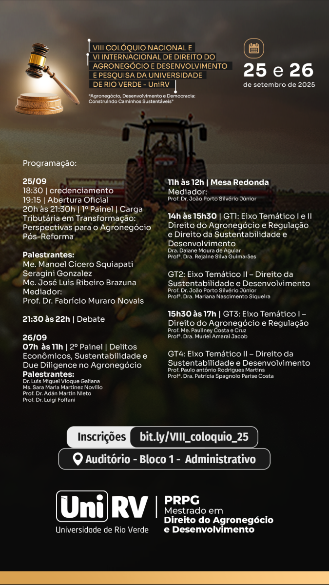 A Universidade de Rio Verde será palco, nos dias 25 e 26 de setembro de 2025, do VIII Colóquio Nacional e VI Internacional de Direito do Agronegócio e Desenvolvimento e Pesquisa, um dos mais importantes encontros acadêmicos sobre a interface entre direito, sustentabilidade e produção agrícola. Com o tema “Agronegócio, Desenvolvimento e Democracia: Construindo Caminhos Sustentáveis”, o evento reunirá pesquisadores nacionais e internacionais para discutir os rumos do setor e os desafios jurídicos e regulatórios que acompanham seu crescimento.