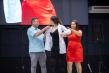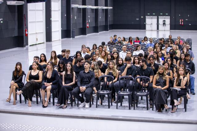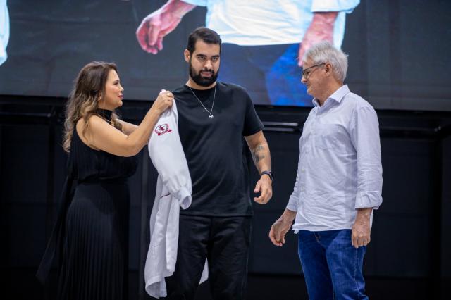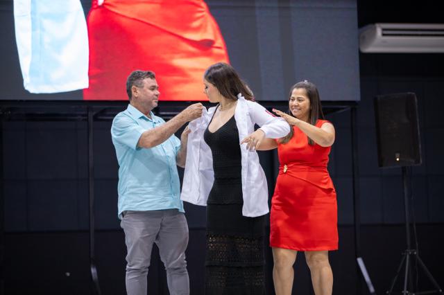 Após os discursos, os familiares subiram ao palco para vestir os jalecos nos calouros, em um gesto simbólico de amor, confiança e apoio.