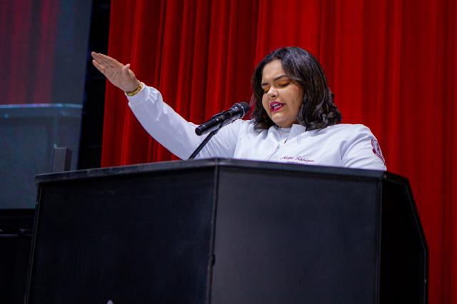 Em seguida, a acadêmica Maysa Rodrigues Pereira conduziu o juramento do calouro, reafirmando o compromisso dos novos estudantes com os princípios éticos e humanitários da profissão.