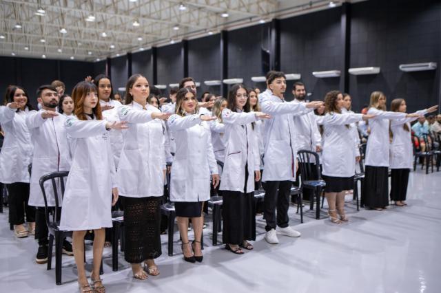 Famílias, professores e autoridades da Universidade acompanharam o momento em que os calouros receberam o jaleco, símbolo da responsabilidade, da dedicação e da vocação para o cuidado com o outro.