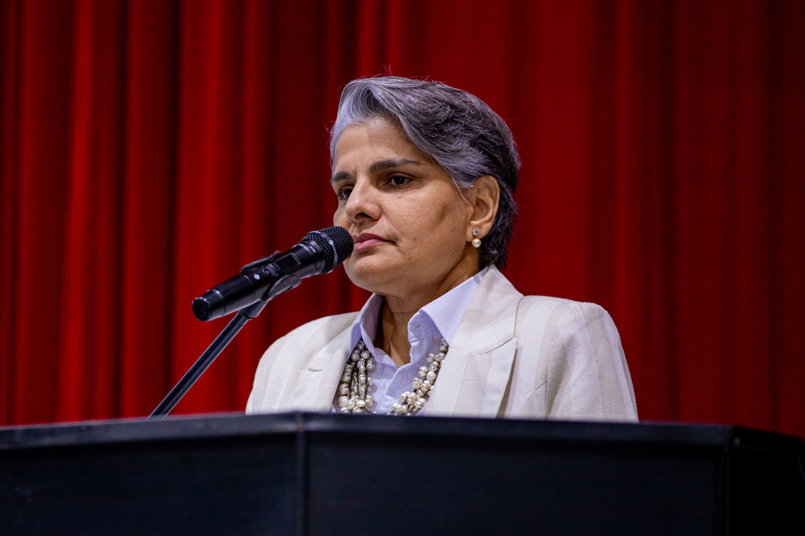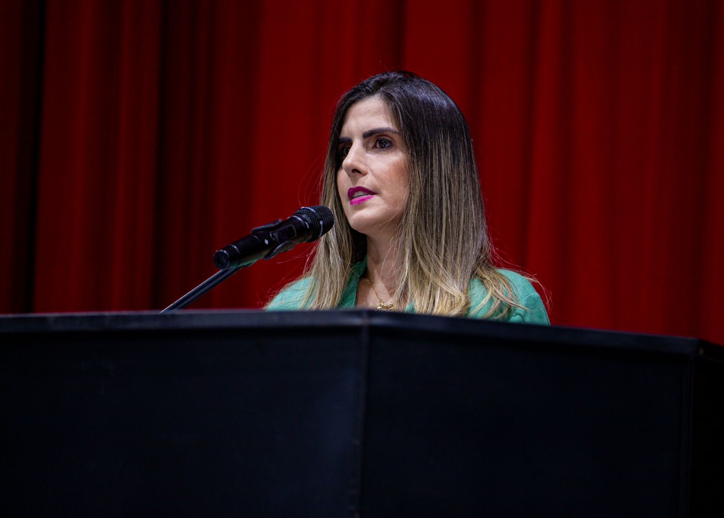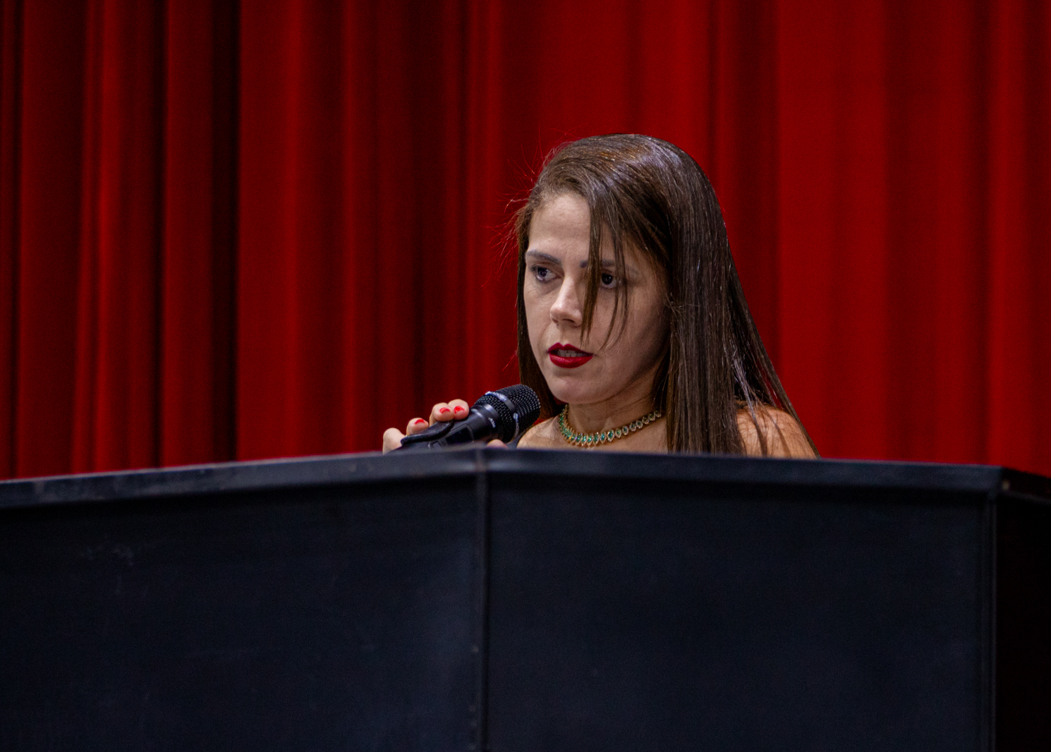 Em seguida, a Sra. Jois Rosa Pereira da Silva, mãe de uma das calouras, falou em nome das famílias, emocionando o público ao expressar o orgulho e a fé na nova jornada.