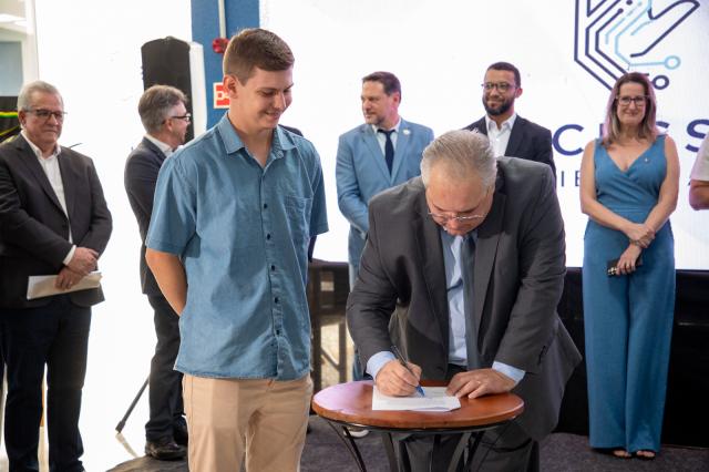 Em seu discurso, o reitor Alberto Barella realizou ainda a assinatura da proposta de lei do Edital de Incentivo à Pesquisa e Inovação, a ser encaminhada ao Legislativo Municipal, com previsão de R$ 1 milhão em fomento para startups e projetos tecnológicos.
