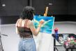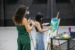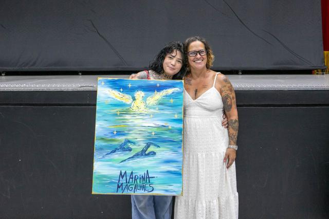 Paula foi presenteada com a tela pintada por Táina durante o evento. Na imagem estão representadas a professora, Ailton e Marina, a grande força por trás de todo o projeto.