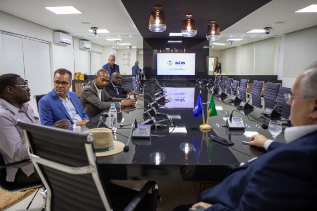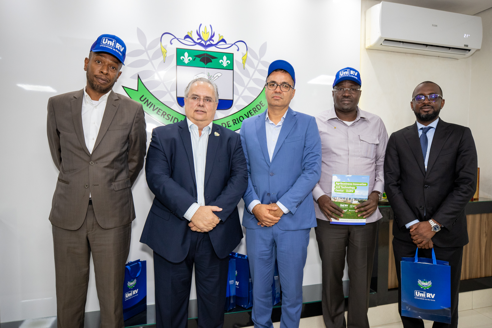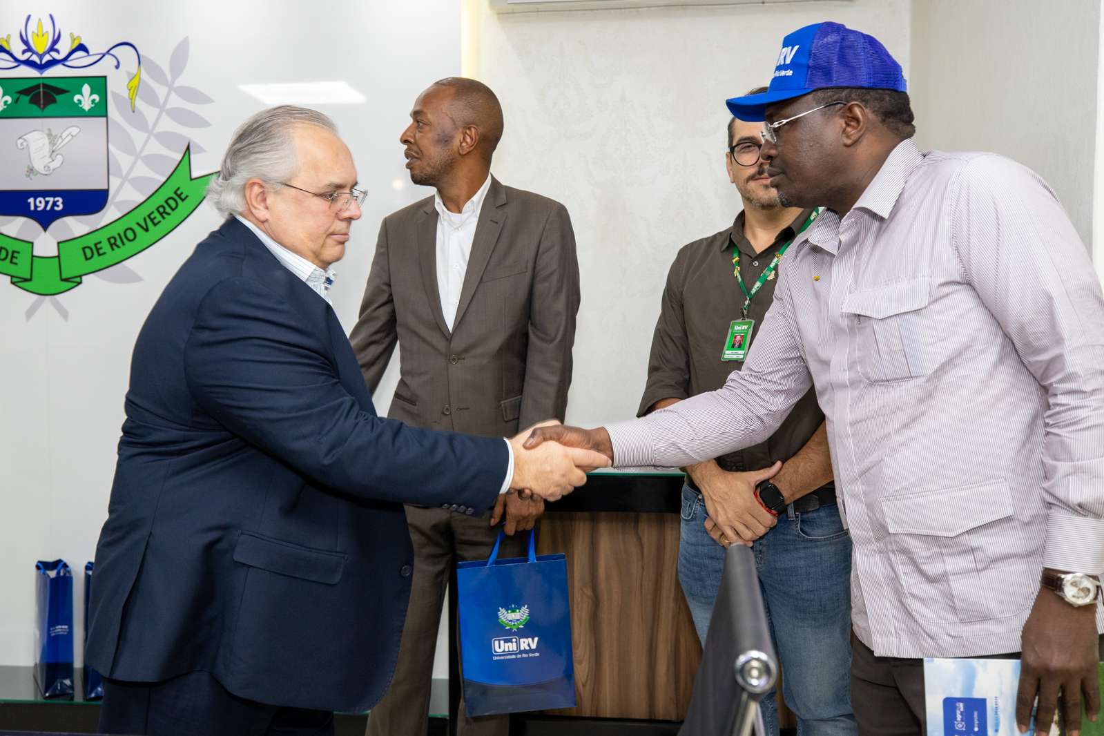 O reitor, Professor Dr. Alberto Barella Netto, recebeu ontem na UniRV, o CEO, Samba Bathily; Mamadou Grame, Conselheiro Sênior do CEO; Hasani Damazio, CEO do Rio Verde Group; Hugo Leonardo Sares Bento, Diretor Regional do Rio Verde Group; Maicon José Aissa, Diretor Grupo Terra Forte; Ricardo Aparecido da Silva, Gerente de Produção Sementes Marambaia; Fernando Teixeira de Moura, Diretor da Optimus Animal Feed e o Professor Me. Ricardo Padilha, Diretor do Departamento de Mobilidade e Integração Global, para dar início às negociações.