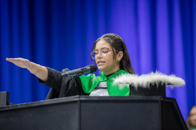 Encerrando os discursos da noite, a Pró-reitora de Graduação, destacou a jornada acadêmica e parabenizou a todos pela conclusão de seus cursos. “Hoje celebramos, acima de tudo, os formandos, que protagonistas desta conquista construída com esforço, disciplina e perseverança. Cada etapa vencida ao longo da trajetória acadêmica reflete o comprometimento de cada um de vocês com o próprio futuro. Parabenizo a todos por essa vitória e desejo que levem consigo o conhecimento, os valores e a confiança necessários para alcançar grandes realizações. Fique com Deus,” finalizou a Professora.