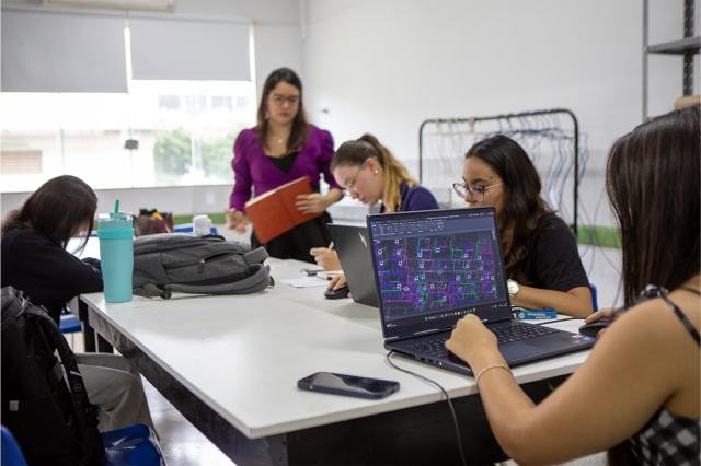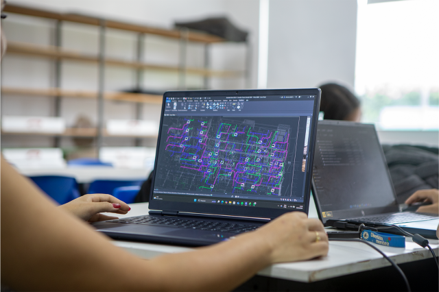 Entre os primeiros trabalhos do semestre está o desenvolvimento do projeto de um museu. A Professora conta que as equipes já foram organizadas para iniciar os levantamentos técnicos: materiais, planta arquitetônica, áreas externas, fachadas e acessos. Cada etapa ficará sob responsabilidade de uma dupla de estudantes, estimulando o trabalho em equipe e a divisão de tarefas, tudo muito semelhante à como ocorre no mercado profissional.